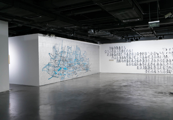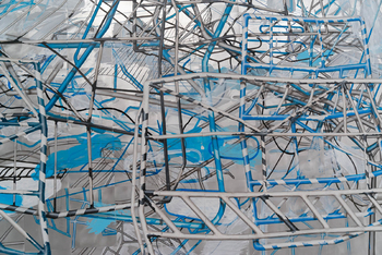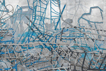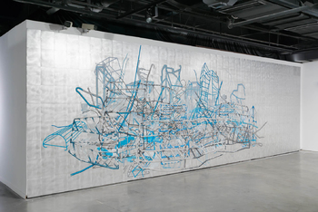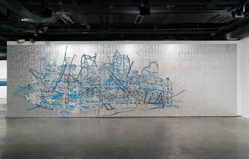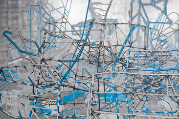 blue: BARRICADE, acrylic paint on aluminium plates, about 9 x 3 m
