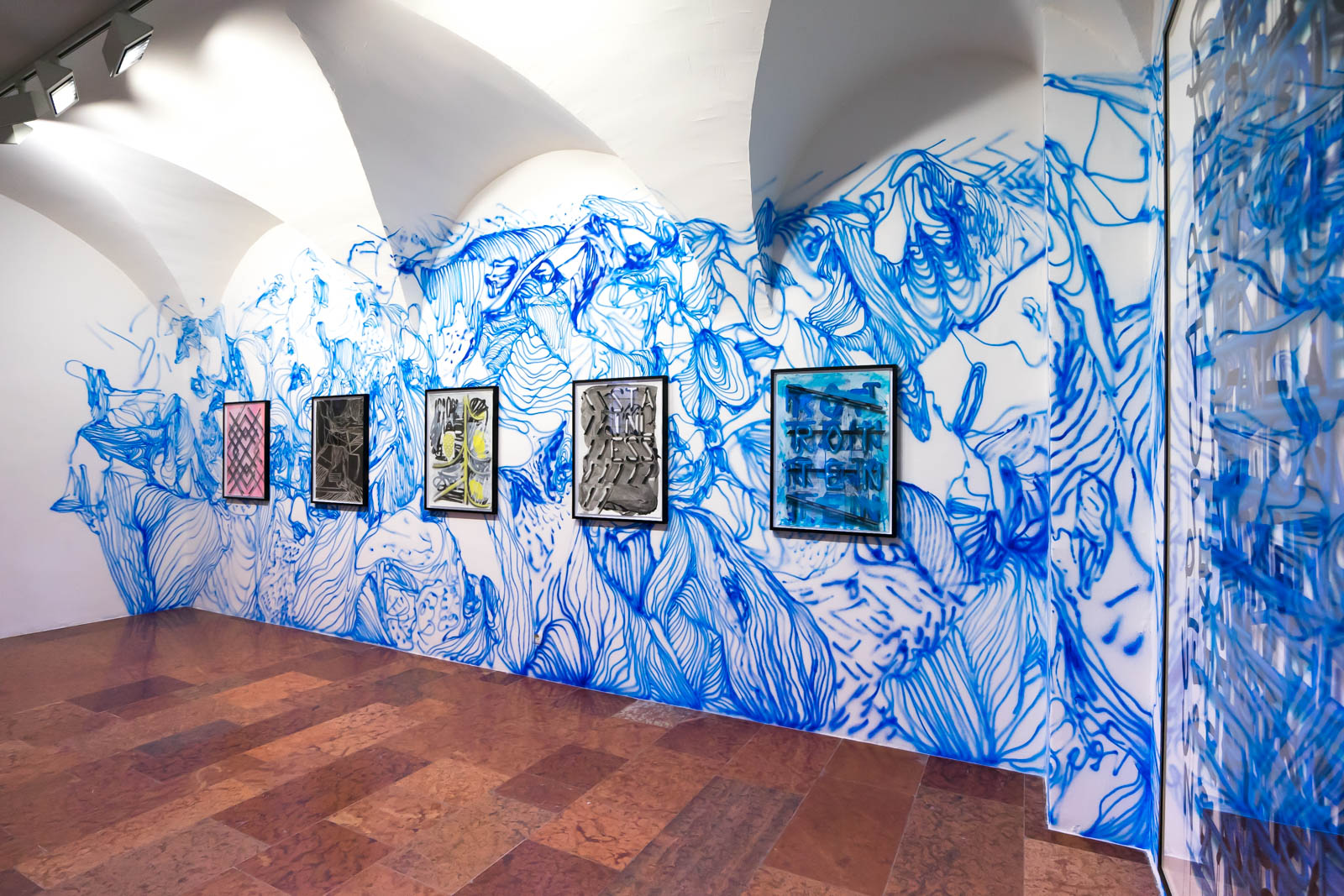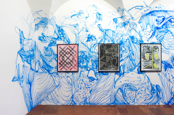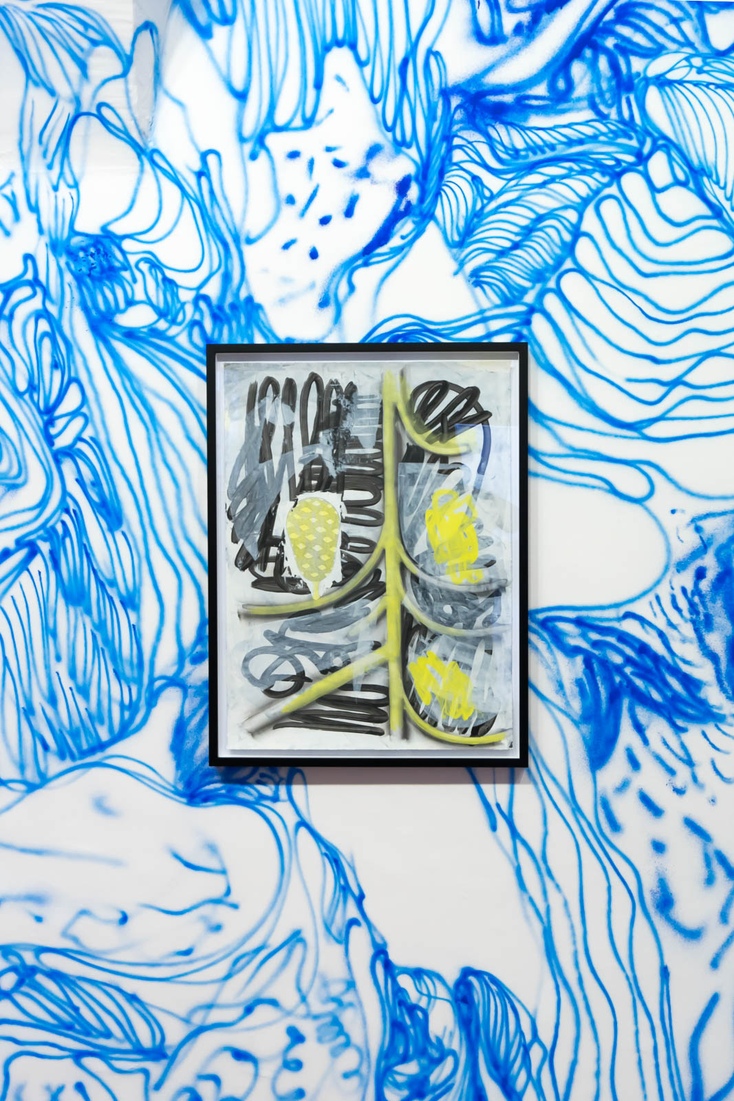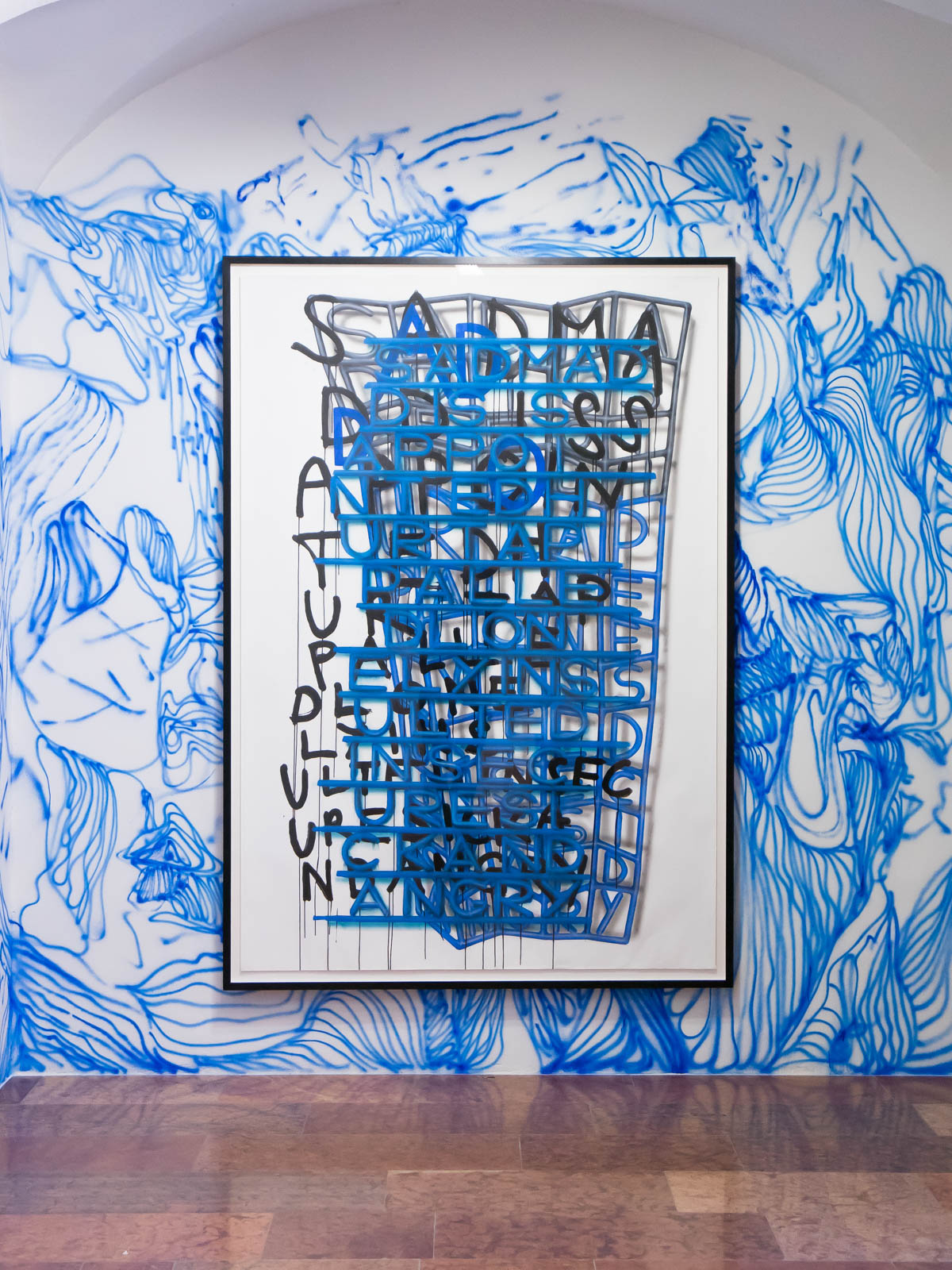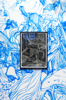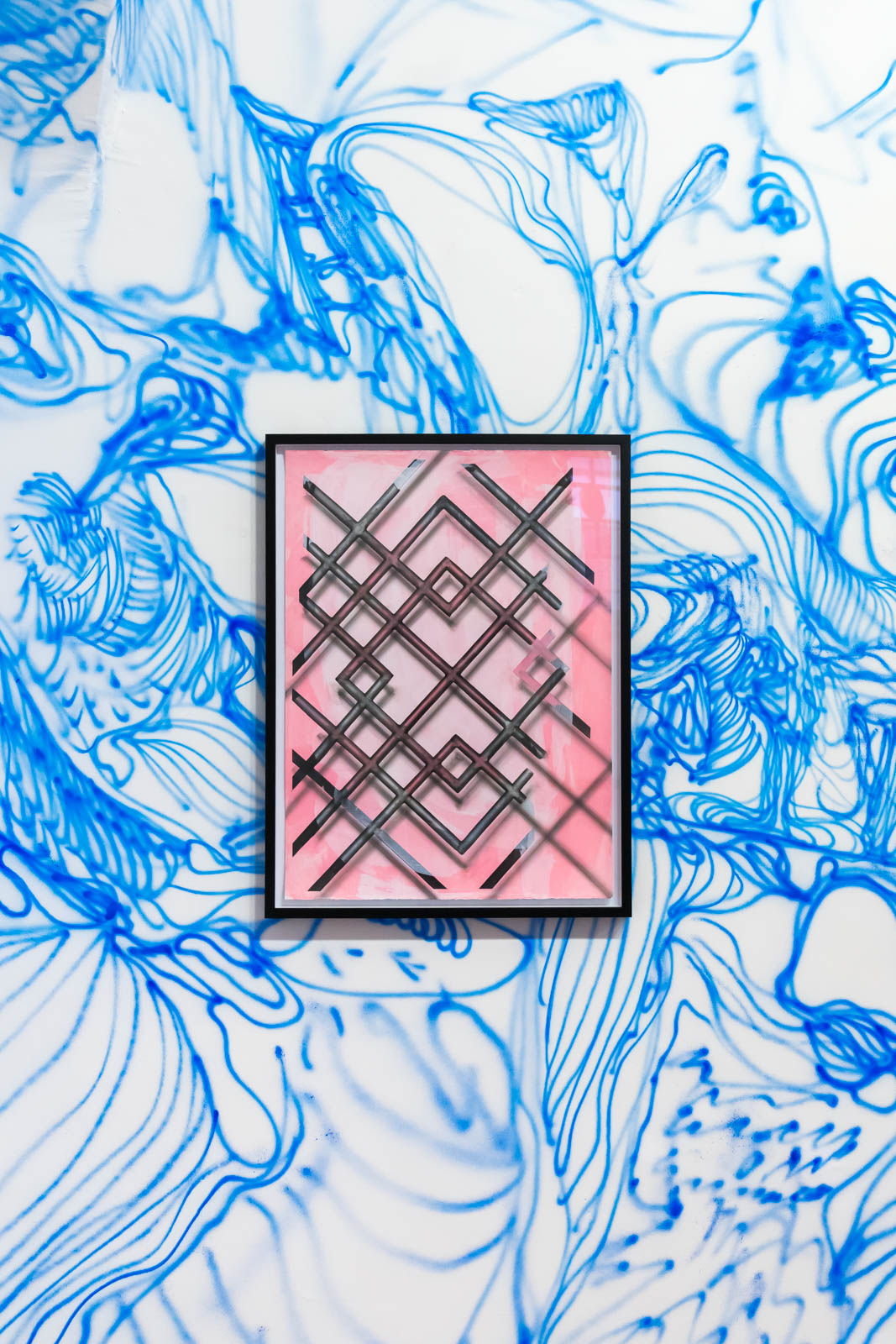 ink on wall, framed single works FRUIT, PARALLEL, TEMP, SADMA