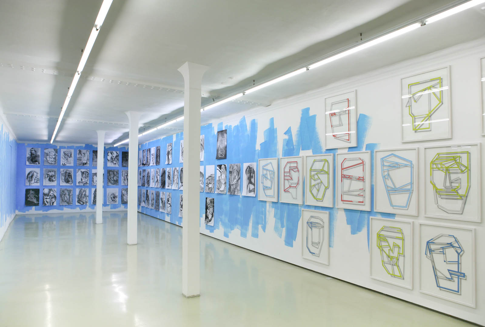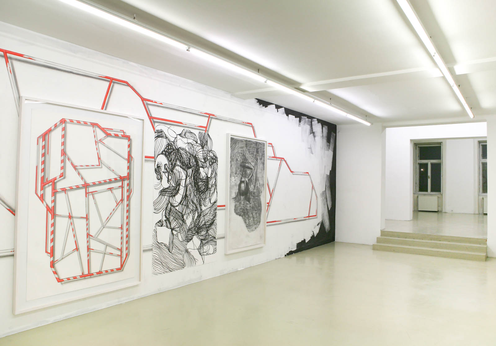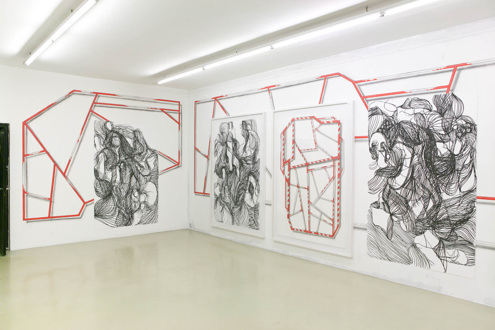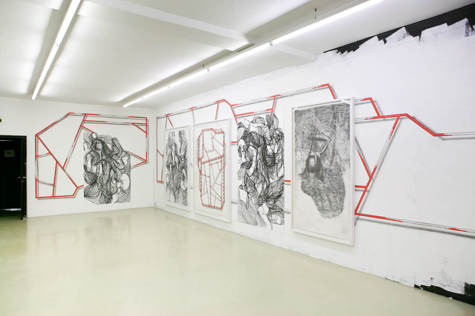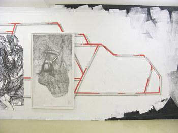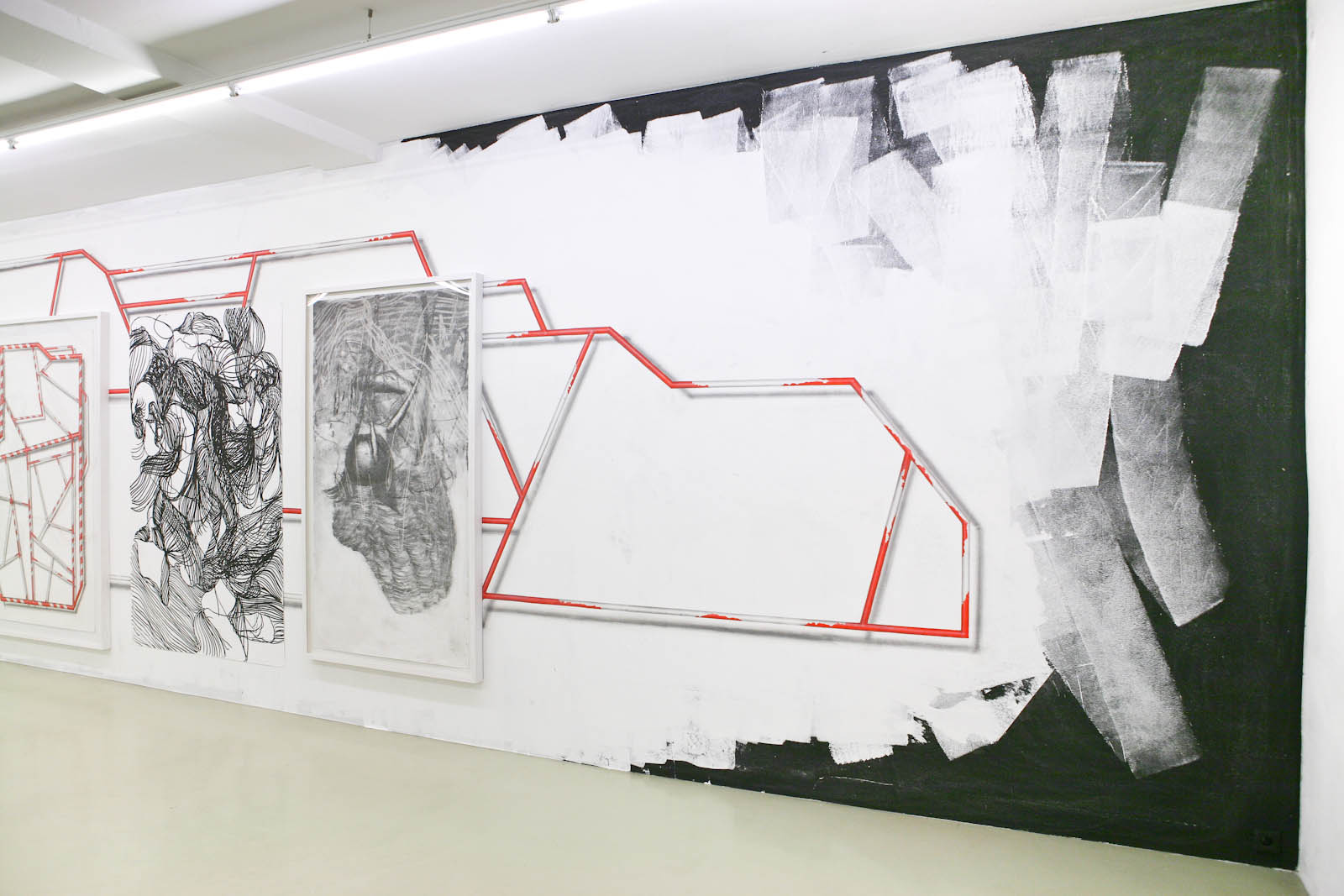 drawing:installation in three rooms acrylic paint and charcoal on paper acrylic paint on wall, tools