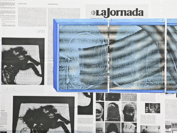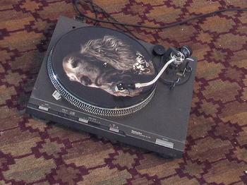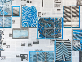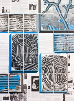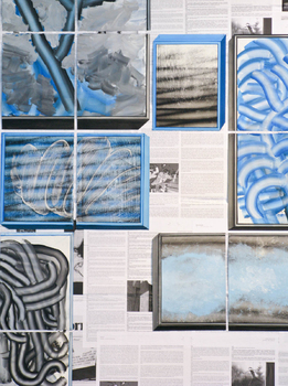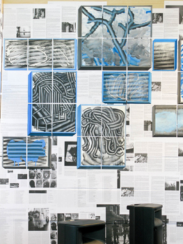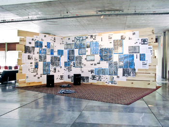 collaboration with Manfred Grübl installation,ca 300 x 700 cm, acrylic paint on aluminium plates newspaper on wooden construction, nails, carpet, record player with soundwork by Manfred Grübl