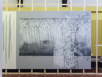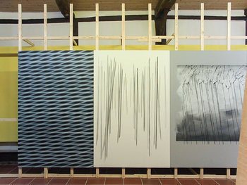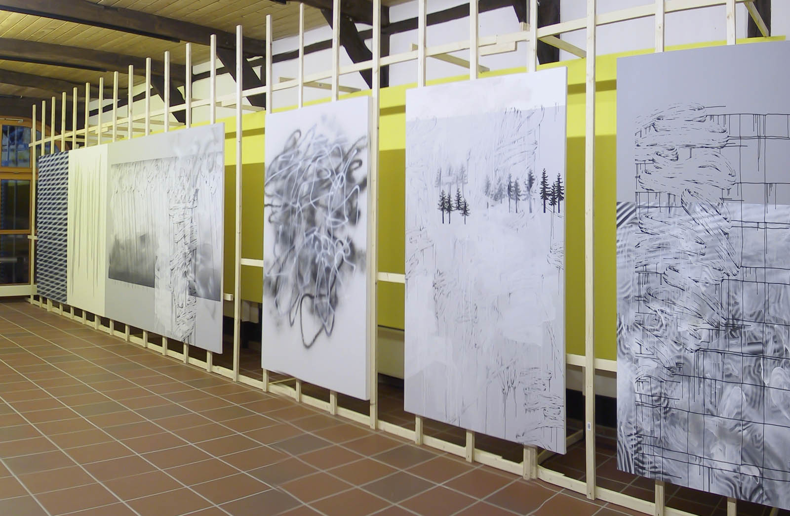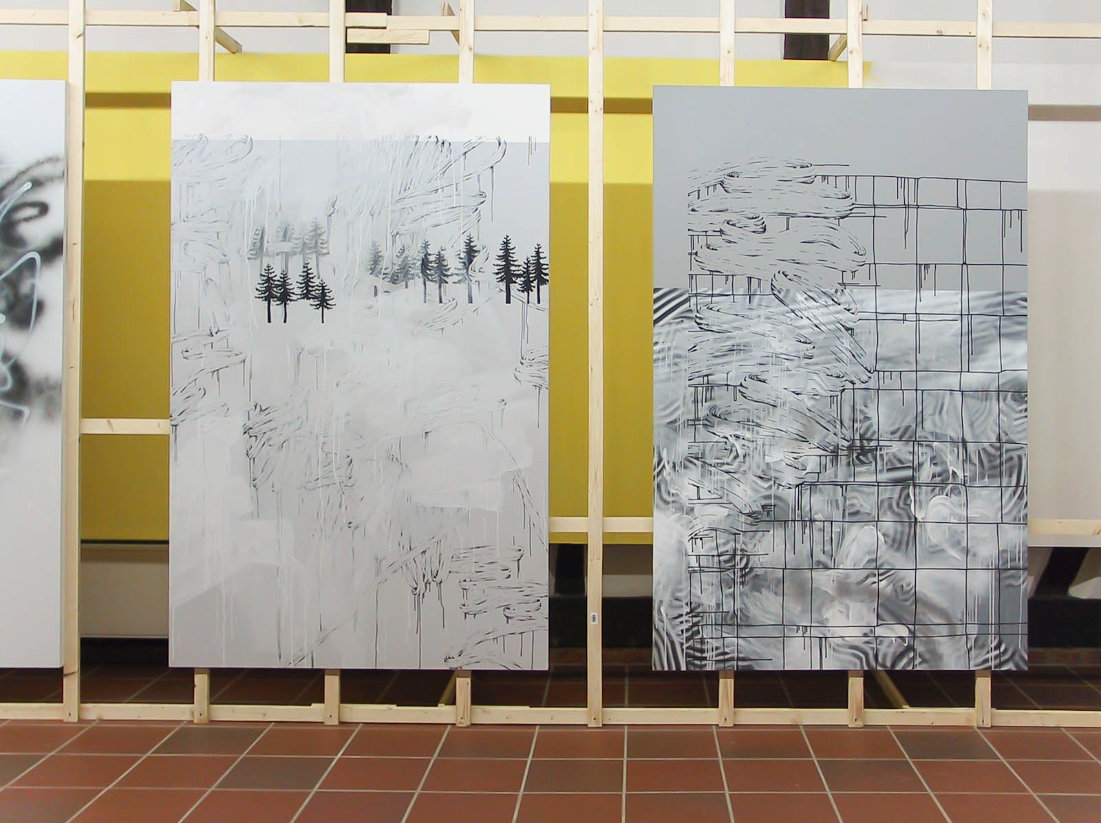 200 x 130 cm each, background of yellow panels and paper, yellow and white neon lighting